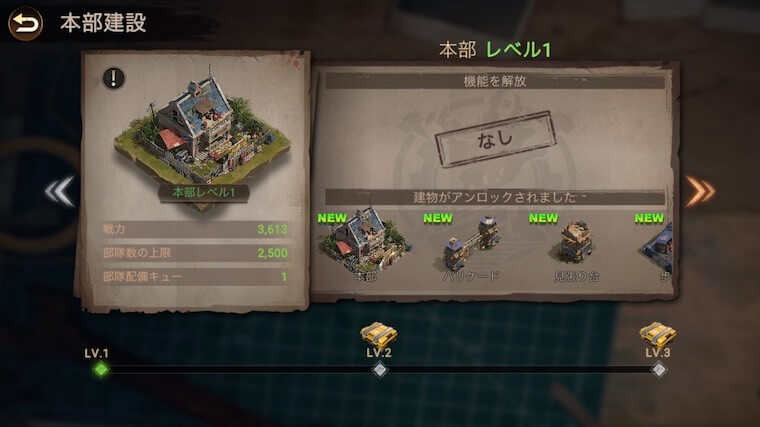 本部レベルを上げると、新たな機能や施設を解放でき、シェルターをより発展させることが可能です。