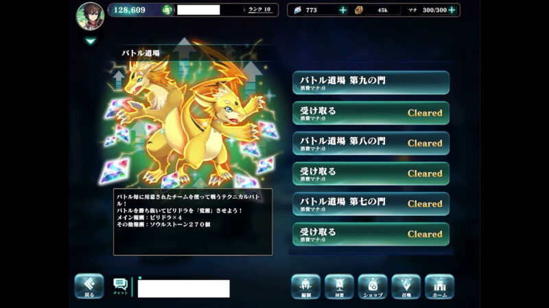 トレーナー道場を全てクリアすると、ソウルストーンが270個、ビリドラ4体を貰えます。