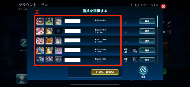 次に赤枠②の中から使用したい傭兵を選択。