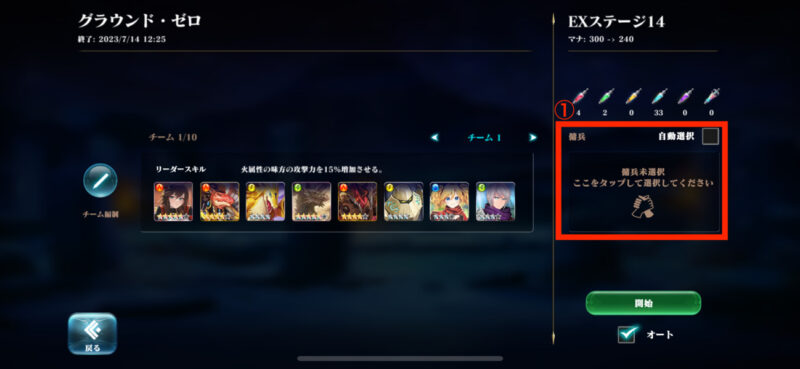傭兵の使用方法は戦闘開始前に赤枠①をタップ