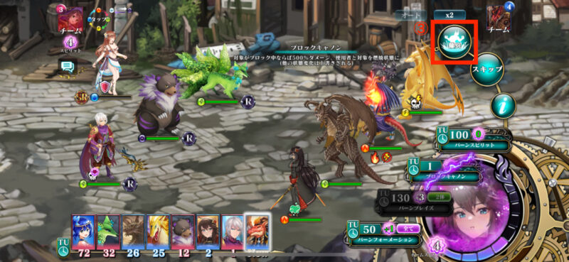 戦闘開始後は画面右上の赤枠③をタップ。